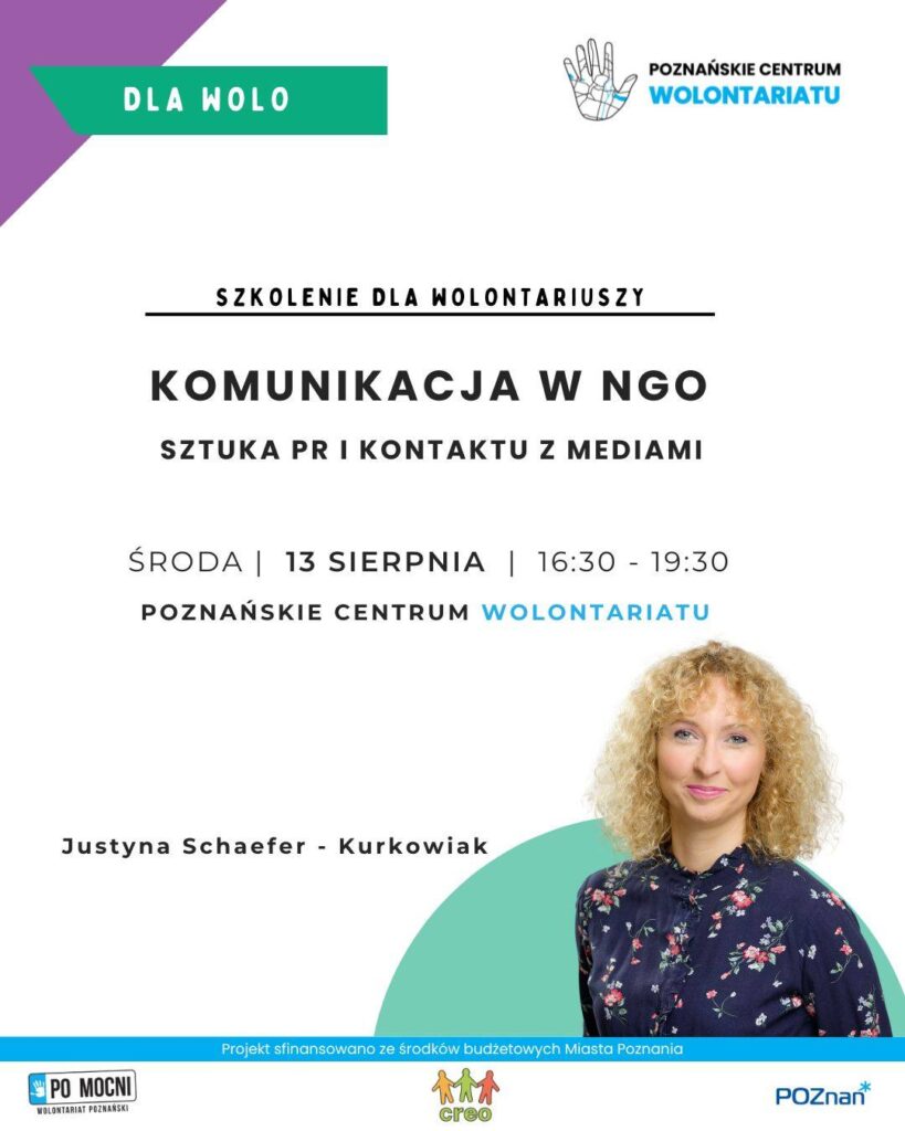 Szkolenie prowadzi: Justyna Schaefer – Kurkowiak – od 20 lat związana z sektorem pozarządowym. Na co dzień pracuje w Stowarzyszeniu Centrum PISOP. Jest także prezeską zarządu Fundacji Niwa Edukacji i Rozwoju i Fundacji Pełny Kurnik. Jest specjalistką ds. komunikowania i budowania partnerstw.