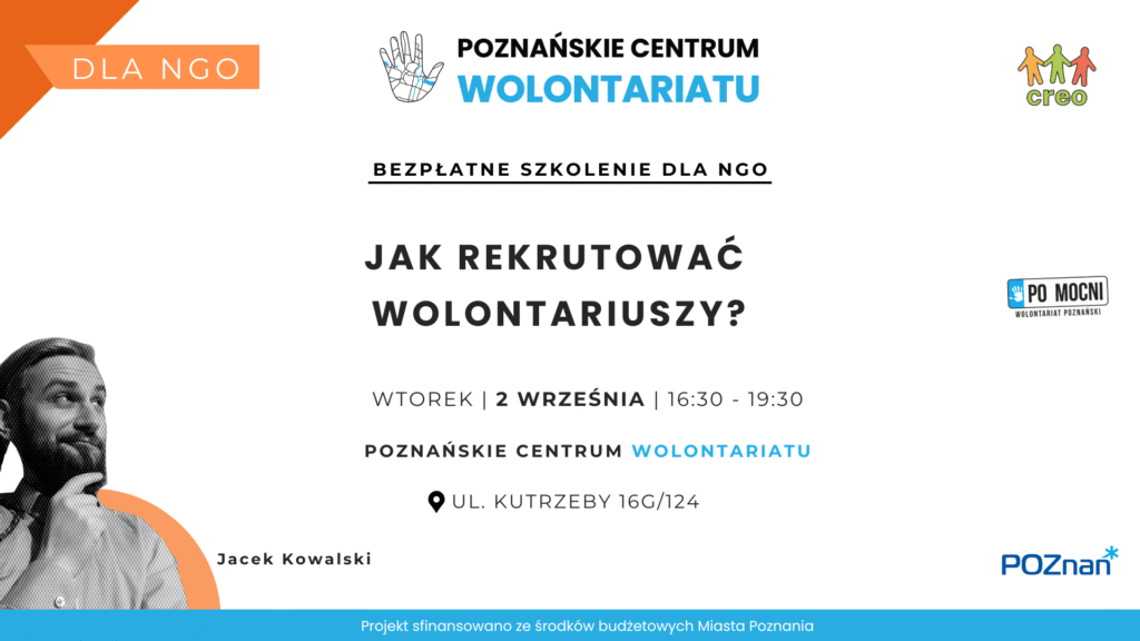 Szkolenie prowadzi: Jacek Kowalski – pracownik i trener w Stowarzyszeniu CREO, pedagog. Przez 8 lat był koordynatorem wolontariatu w Towarzystwie Pomocy Głuchoniewidomych, która w 2013 roku otrzymała tytuł Organizacji Przyjaznej Wolontariuszom (Fundacja Pracownia Badań i Innowacji Społecznych „Stocznia”)